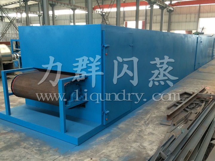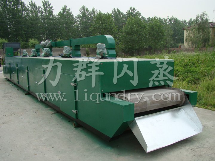 物料由加料器均勻地鋪在網(wǎng)帶上,網(wǎng)帶一般采用12-60目不銹鋼絲網(wǎng),由傳動裝置拖動在干燥機內(nèi)移動。干燥機由若干單元組成,每一單元熱風(fēng)獨立循環(huán),部分尾氣由專門排濕風(fēng)機排出,廢氣由調(diào)節(jié)閥控制,熱氣由下往上或由上往下穿過鋪滿物料的網(wǎng)帶完成熱量與質(zhì)量傳遞的進程,帶走物料水份。網(wǎng)帶緩慢移動,運行速度可根據(jù)物料溫度自由調(diào)節(jié),干燥后的成品連續(xù)落入收料器中。上下循環(huán)單元根據(jù)用戶需要可靈活配備,單元數(shù)量亦可根據(jù)需要選取。