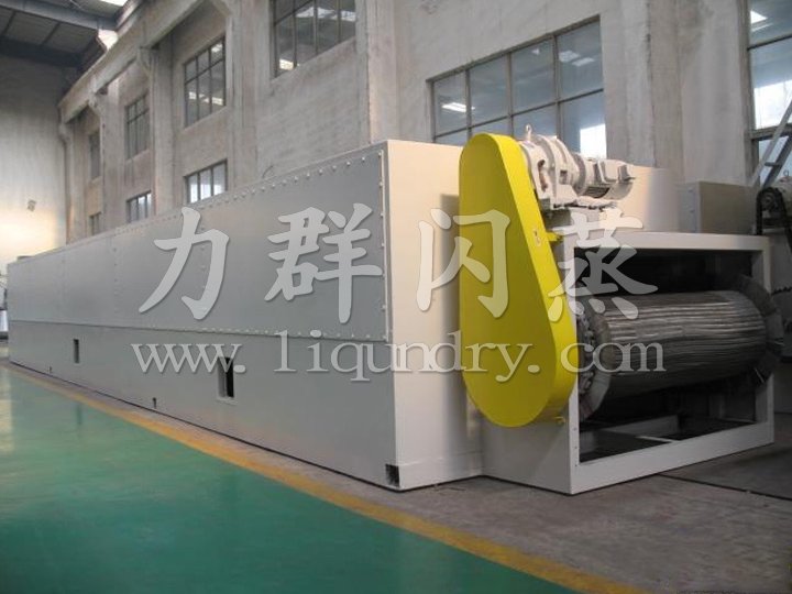 整個(gè)生產(chǎn)線為全封閉型(對(duì)物料而言),由擺動(dòng)布料段、干燥段、出料段三部分組成。擺動(dòng)布料段作用使海藻均勻分散在網(wǎng)板上,并且勻速輸送到干燥段,海藻經(jīng)過80℃熱風(fēng)干燥段,90℃熱風(fēng)干燥段和120℃熱風(fēng)干燥段后,再經(jīng)過出料段排料。循環(huán)風(fēng)向及各單元內(nèi)風(fēng)的循環(huán)為向下式,即加熱后的空氣由引風(fēng)機(jī)吸入,在風(fēng)機(jī)出風(fēng)口首先預(yù)分布再經(jīng)過孔板均風(fēng)后,熱風(fēng)從物料的下面向上(或從物料的上面向下)穿透物料層。